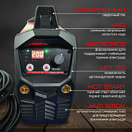 Компактный и мощный источник на 200А. Регулировка горячего старта, форсирования дуги и функция антизалипания электрода.