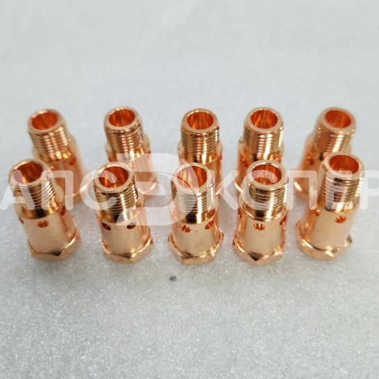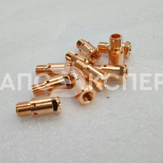 Латунный держатель для фиксации токосъемных наконечников М8 в газовых соплах горелок Kemppi PMT 52W и MMT 52W. Обеспечивает надежный электрический контакт и стабильность дуги при высоких токах.