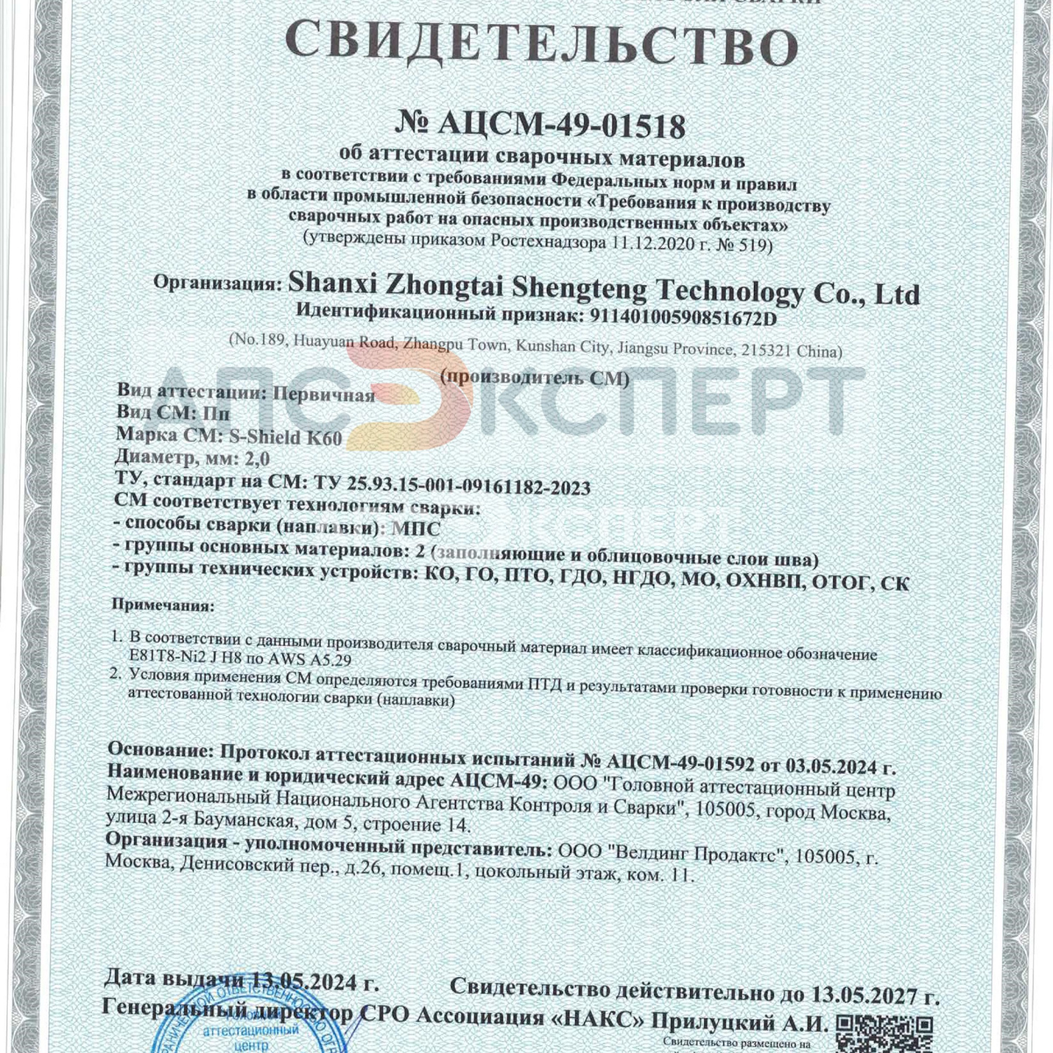 - Сертификация: НАКС
